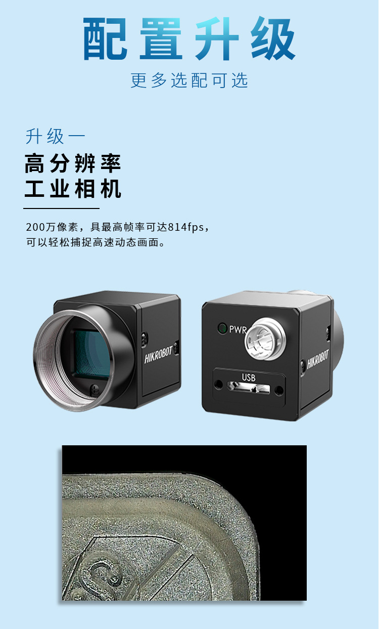 升级一:高分辨率工业相机。200万像素,具最高帧率可达814fps,可以轻松捕捉高速动态画面。