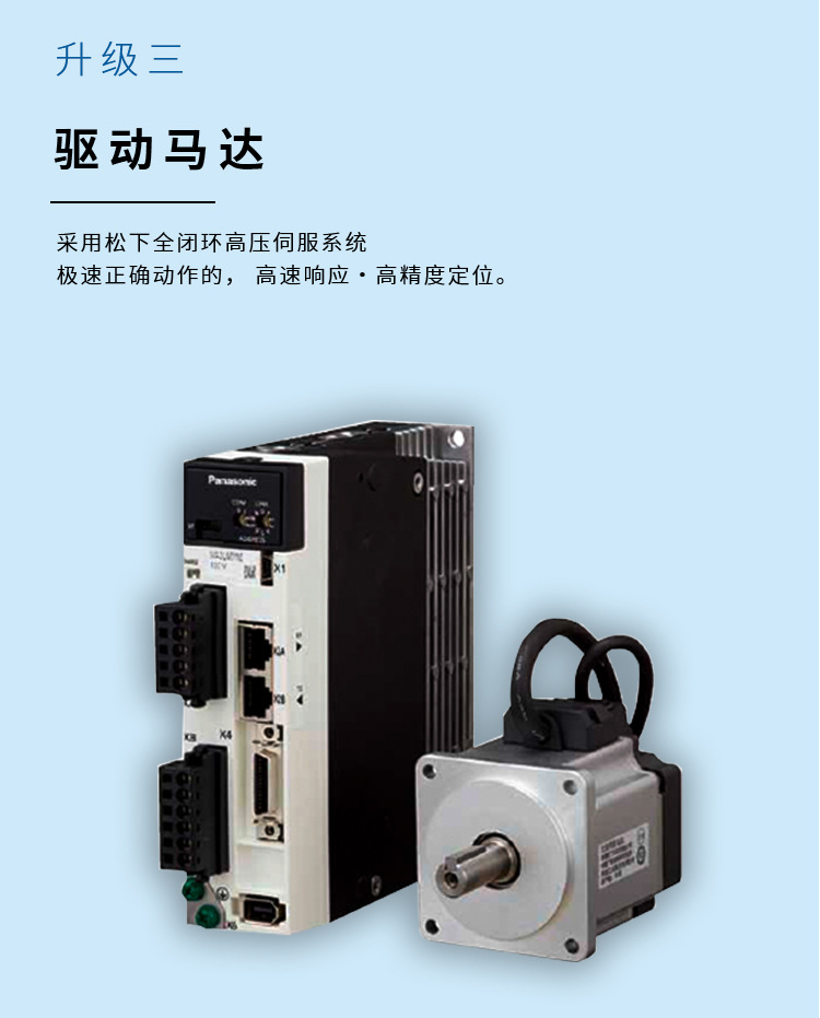 升级三:驱动马达。采用松下全闭环高压伺服系统,极速正确动作的,高速响应,高精度定位。